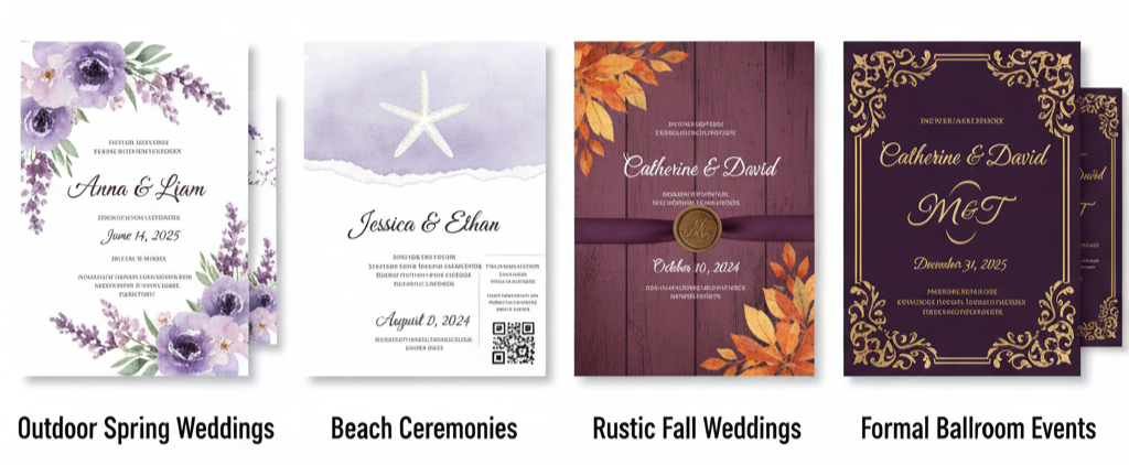 Key takeaway: You’re not limited to one shade of purple. Combine two or more tones like lavender and plum to create a layered, visually stunning invitation suite.