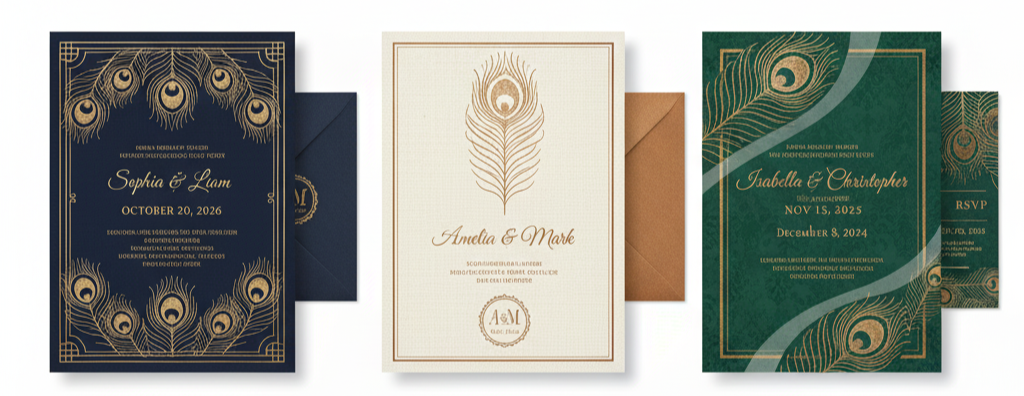 Peacock invitations are unlike traditional wedding stationery because they combine striking visuals with luxurious materials. They feature layered textures, shimmer paper, and metallic accents that elevate the entire design. Designers love to use rich color palettes and mix printing methods to create depth and personality.
