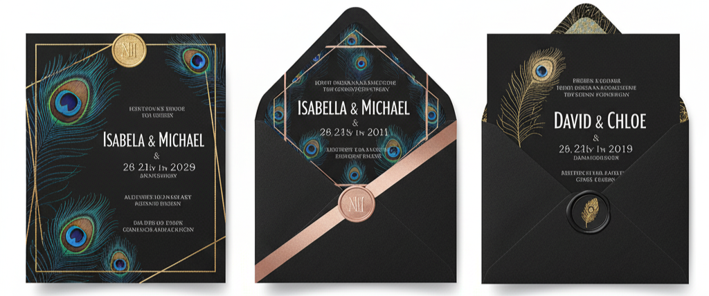 - Design Personalization: Add your initials within the feather design or commission a custom illustration featuring two peacocks. Small design tweaks can make your invitation truly yours.