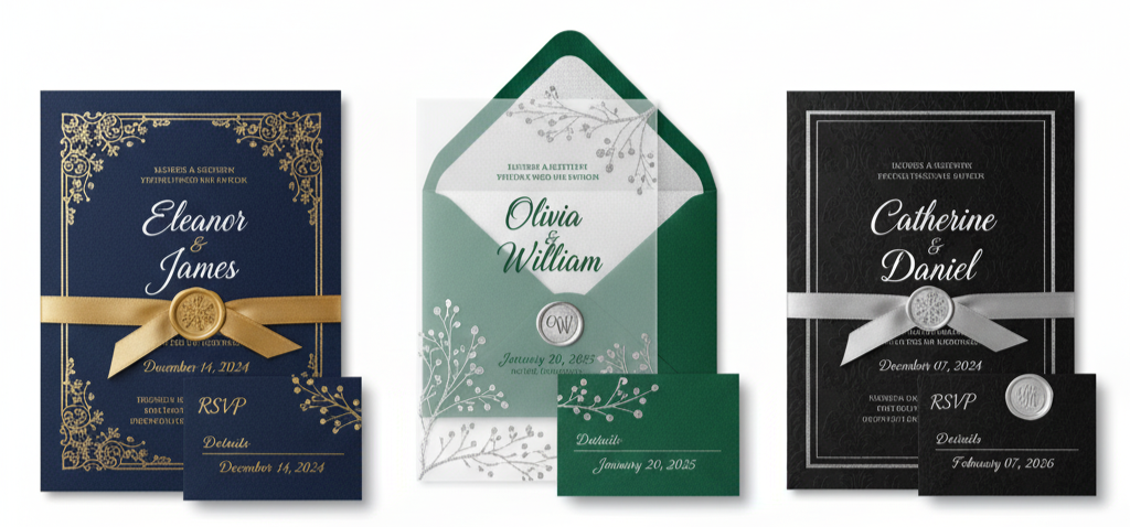 | Classic Glamour | Navy, Green, Gold, Silver | Foil, Vellum, Satin | Ballrooms, Formal Venues |