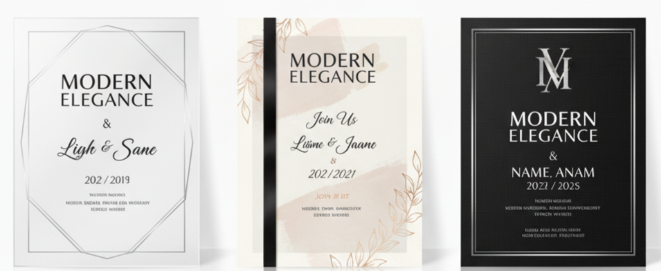 Modern elegance blends minimalism with creativity. These invitations focus on clean lines, bold typography, and uncluttered layouts. Materials like acrylic or vellum give them a sleek edge, while neutral tones such as gray, ivory, or black create a balanced, contemporary feel. A touch of metallic detailing like silver or rose gold foil adds sophistication. Perfect for urban weddings or venues with a modern aesthetic.