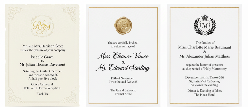 Use traditional phrasing, full names, and proper titles. Keep the tone formal and avoid casual or abbreviated wording for a refined presentation.