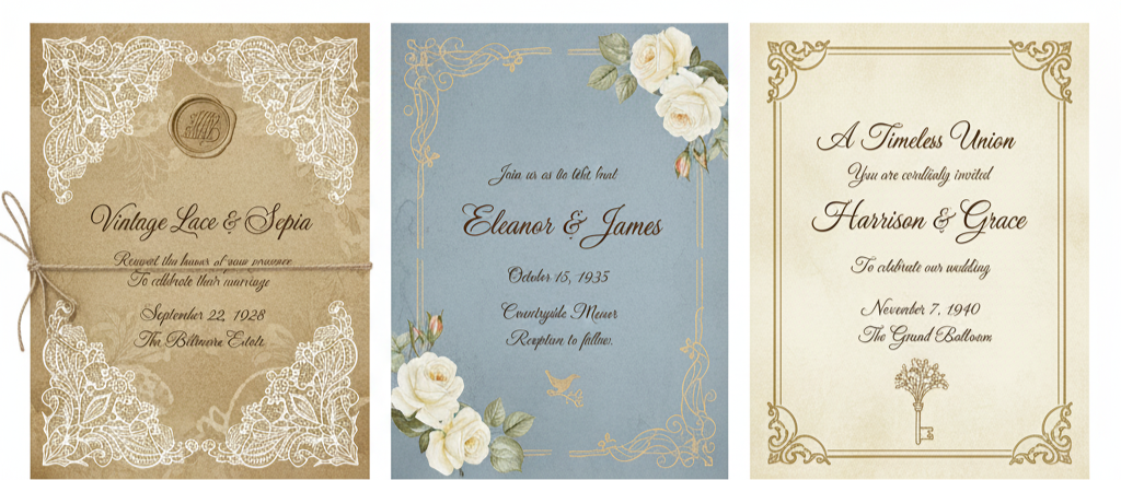 | Vintage Elegance | Antique borders, lace, wax seals | Historic or rustic locations |